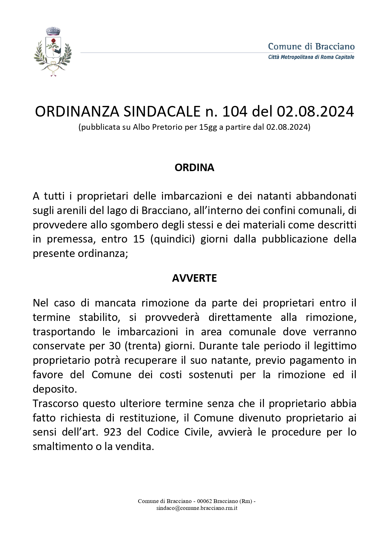 22 Novembre 2024 25 anni di Parco Bracciano-Martignano Grande evento organizzato oggi a Spazio Porta del Parco: l'ente regionale si appresta a spegnere le candeline con la comunità del territorio Leggi di più Domenica 13 Ottobre 2024 𝐆𝐈𝐎𝐑𝐍𝐀𝐓𝐀 𝐍𝐀𝐙𝐈𝐎𝐍𝐀𝐋𝐄 𝐃𝐄𝐋 𝐂𝐀𝐌𝐌𝐈𝐍𝐀𝐑𝐄 𝟐𝟎𝟐𝟒 In occasione della Giornata Nazionale del Camminare di Federtrek, il Parco Naturale Regionale Bracciano-Martignano con il Patrocinio del Comune e dell’Università Agraria di Manziana, in collaborazione con il Gruppo Ambiente Manziana e con l’associazione Sagra della Castagna di Manziana organizzano una camminata all’interno del Bosco Macchia Grande di Manziana. Leggi di più Venerdì 20 Settembre 2024 Vigna di Valle, al cambio del Comando anche il Parco "Il Museo Storico dell'Aeronautica Militare fiore all'occhiello per il turismo nell'area naturale protetta" Leggi di più 8 Agosto 2024 RIMOZIONE IMBARCAZIONI E NATANTI ABBANDONATI SUGLI ARENILI DEL LAGO: ORDINANZA DEL SINDACO, I GUARDIAPARCO DEL PARCO NATURALE REGIONALE BRACCIANO-MARTIGNANO VIGILERANNO CON LA POLIZIA LOCALE Con ordinanza sindacale del 2 Agosto 2024, Marco Crocicchi (Sindaco di Bracciano - Città Metropolitana di Roma) ha disposto la rimozione imbarcazioni, natanti e attrezzature varie abbandonate sugli arenili del lago di Bracciano, demandando la vigilanza, il controllo e la verifica alla Polizia Locale e ai Guardiaparco del Parco Naturale Regionale Bracciano-Martignano. Leggi di più Martedì 6 Agosto 2024 BASSABO ROMANO - COMUNICAZIONE Il Parco Naturale Regionale Bracciano-Martignano rilancia la comunicazione dell'Università Agraria di Bassano Romano (Viterbo): fino a nuova indicazione la zona Stracciacappello è interdetta causa caduta alberi. Leggi di più Dal 27 al 30 Giugno 2024 CIAKNATURA il Parco come non l'avete mai visto Dal 27 al 30 Giugno 2024 l'ente di gestione del Parco Naturale Regionale Bracciano-Martignano promuove una rassegna gratuita di appuntamenti e passeggiate dedicatI all'ambiente e al cinema: l'obiettivo è scoprire il valore culturale e artistico del Parco attraverso i film che negli anni sono stati girati nell'area naturale protetta. Leggi di più Venerdì 7 giugno 2024 AVVISO DI CONVOCAZIONE DELLA TERZA SEDUTA PUBBLICA DEL SEGGIO DI GARA PER LA VERIFICA DELLE OFFERTE ECONOMICHE Bando Bando di gara - CUP C14E21001870002 - CIG 9549217727 Leggi di più 30 maggio 2024 Aggiornamento elenco operatori del Settore di Educazione Ambientale e di Sostenibilità Ambientale per il Parco di Bracciano Martignano anno 2024. Aggiornamento elenco operatori del Settore di Educazione Ambientale e di Sostenibilità Ambientale per il Parco di Bracciano Martignano anno 2024. Leggi di più Lunedì 27 Maggio 2024 Servizio Civile Universale Il Parco Naturale Regionale Bracciano Martignano è entrato nel mondo del Servizio Civile Nazionale la prima volta nel 2010 e dal 2022 è nel progetto del Servizio Civile Universale. Leggi di più Lunedì 27 Maggio 2024 Il Parco, il Comune e l’Università Agraria Insieme per il Monumento Naturale Regionale Caldara di Manziana Firma del protocollo d'intesa per la gestione del sito protetto Leggi di più Sabato 25 e Domenica 26 Maggio 2024 La grande vela dal lago di Bracciano si sposta al Circeo - FESTA FINALE DELLA SETTIMANA EUROPEA DEI PARCHI 2024 Quest'anno la Settimana Europea dei Parchi si svolge da sabato 18 a domenica 26 maggio 2024. La Regione Lazio, con il suo Sistema di oltre 100 aree naturali protette, festeggia la ricorrenza con un ricco calendario di eventi e attività centrate sul tema Natura e Sport. Leggi di più Giovedì 23 Maggio 2024 “Salviamo la regina”, dai ragazzi il progetto sulle api nel Parco Bracciano-Martignano Nella Settimana Europea dei Parchi si è concluso il programma di educazione ambientale GENS: a Bracciano gli studenti di Roma hanno scoperto l’importanza del mondo apiario Leggi di più
