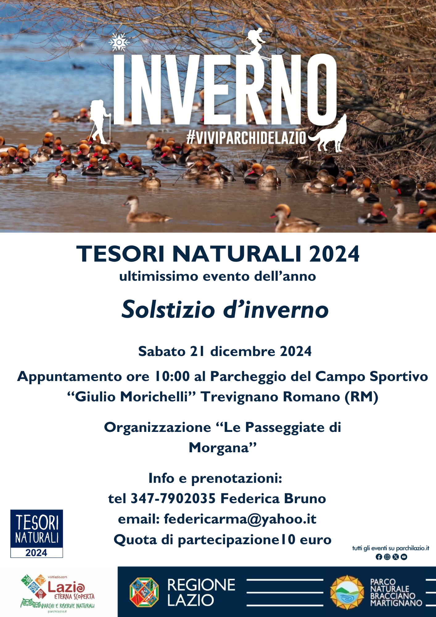 21 Dicembre 2024 Solstizio d'Inverno - TESORI NATURALI 2024 Il solstizio segna la notte piu’ lunga dell’anno, ma la luce, che sembrava scomparsa per sempre, comincia a riemergere con un primo impercettibile bagliore Leggi di più 15 Dicembre 2024 Trevignano Romano tra boschi, panorami e la Rocca Orsini- TESORI NATURALI 2024 Attraversando ii sentiero di San Bernardino da Malpasso giungeremo presso un belvedere da cui si ammira uno splendido panorama sul Iago. Leggi di più 14 Dicembre 2024 Trekking naturalistico la Caldara di Manziana ed il Bosco Grande - TESORI NATURALI 2024 Un trekking naturalistico che ci porterà a scoprire Manziana i suoi boschi e fenomeni vulcanici come la Caldara. Percorreremo i bellissimi e silenziosi sentieri fitti di alberi di antica memoria, scopriremo le storie legate ai luoghi. Leggi di più 14 Dicembre 2024 Meraviglie della Tuscia: tra storia, archeologia e natura nell'Antichissima Città di Sutri - TESORI NATURALI 2024 Cammineremo immersi nella Natura e nella Storia di un luogo straordinario. Leggi di più 7 Dicembre 2024 L’ANELLO DELLA MACCHIA DI MANZIANA E LA CALDARA - TESORI NATURALI 2024 Dopo una partenza nel bosco di Macchia Grande, usciremo dal folto per ritrovarci in un luogo sorprendente: una Caldera vulcanica, situata in un'ampia pianura paludosa nella quale affiorano vapori di zolfo e piccoli geyser! Si tratta, probabilmente, di un piccolo cratere a testimonianza attuale della antica presenza del Vulcano Sabatino, che 600.000 anni fa occupava tutta la fossa tettonica compresa fra i Monti della Tolfa e il Monte Soratte. Leggi di più 1 Dicembre 2024 Forest Yoga®: bagno di foresta e Hatha Yoga nel Bosco di macchia Grande Manziana - TESORI NATURALI 2024 Lo Yoga è una disciplina molto antica in grado di generare armonia, equilibrare corpo, mente ed emozioni, apportare un benessere psico-fisico. La Natura ci invita a riscoprire la connessione mente- corpo-spirito, movimento e respiro, pause e azione. In natura ci sentiamo più liberi, meno condizionati da schemi e pregiudizi, e possiamo entrare in contatto più facilmente con la parte più intima di noi, per raggiungere consapevolezza. Leggi di più 24 Novembre 2024 Tutti i nostri sensi - TESORI NATURALI 2024 Breve trekking naturalistico dedicato alle famiglie con bambini età 6/12 anni con lo scopo di usare tutti i nostri sensi attraverso giochi semplici ed immediati per fermarsi ad ammirare il fascino nascosto della natura. Leggi di più 23 Novembre 2024 Naturalmente Ceramica - I COLORI DELLA TERRA – TERRA SIGILLATA- TESORI NATURALI 2024 Un appuntamento alla scoperta delle sfumature cromatiche e tattili delle terre locali. Durante il laboratorio, dopo un introduzione sull'uso della tecnica, andremo a creare degli elementi in argilla che veranno poi decorati con le terre sigillate autoprodotte. Otterremo così oggetti lucidi ma non brillanti, che risultano naturalmente impermeabili. Leggi di più 18 Novembre 2024 THE BOOK CLUB DEL LUNEDI - TESORI NATURALI 2024 trekking naturalistico tra il bosco Macchia Grande di Manziana e la Caldara. Arricchirà la passeggiata di circa 12 km ad anello una pausa dedicata alla condivisione di un libro, possibilmente cartaceo e a tema naturalistico, che ognuno dei trekkers deciderà di portare con se e consigliarne l’approfondimento con gli altri. Leggi di più 17 Novembre 2024 FIABE SOTTO L'ALBERO - TESORI NATURALI 2024 In occasione dell’avvicinarsi della giornata mondiale dell'albero leggeremo insieme storie divertenti, bizzarre, ma soprattutto magiche sul favoloso mondo degli alberi. Scopriremo perché sono tanto importanti per la vita degli abitanti del bosco e di tutti noi!! Leggi di più 17 Novembre 2024 Mindful Trekking lungo il Mignone - TESORI NATURALI 2024 In questa passeggiata i benefici della Forest Therapy si uniscono alla bellezza naturalistica del paesaggio e al suo valore storico-archeologico. Leggi di più 17 Novembre 2024 Negli splendori del Castello con un pizzico di Geologia - TESORI NATURALI 2024 Una nuova visita all’intero dell’imponente Castello Odescalchi, ripercorrendo la sua vita e la sua storia, e arrivati in cima alle torri osserveremo il lago ascoltando suggestive nozioni di geologia. Leggi di più