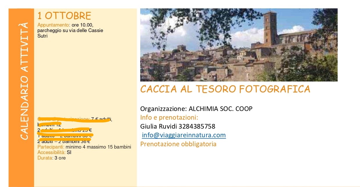 Sabato 5 Novembre 2022 Escursione preistorica - TESORI NATURALI 2022 Un’escursione storico-naturalistica per scoprire e provare le tecnologie preistoriche. Leggi di più Domenica 30 Ottobre 2022 Contest, chi semina raccoglie - TESORI NATURALI 2022 Porta i tuoi semi al Museo della Civiltà Contadina e della Cultura Popolare Augusto Montori per una iniziativa volta a preservare la biodiversità. Leggi di più Sabato 29 Ottobre 2022 Bio blitz alla Caldara, scienziati per un giorno - TESORI NATURALI 2022 Si propone una giornata di Citizen Science: i partecipanti , coadiuvati da naturalisti ed esperti con l’utilizzo di guide naturalistiche cartacee o online , parteciperanno ad un censimento delle specie presenti nell’ambiente del Monumento Naturale della Caldara di Manziana Leggi di più Domenica 23 Ottobre 2022 Silenzi e suoni della natura- TESORI NATURALI 2022 Giornata d’immersione totale nella natura tra alberi d’alto fusto, campi, pascoli liberi e grotte. Insieme scopriremo ed ascolteremo il nostro proprio silenzio e, in esso, silenzi e suoni che la Natura dona Leggi di più Sabato 22 Ottobre 2022 Da Trevignano alla Rocca - Trekking TESORI NATURALI 2022 L’escursione partirà dal Pontile sul lago a Trevignano Romano e si concluderà presso la Rocca degli Orsini; sarà basata sulla lettura del paesaggio geomorfologico, antropico e naturalistico Leggi di più Domenica 16 Ottobre 2022 L'anello di Macchia Grande e la Caldara di Manziana - TESORI NATURALI 2022 Evento gratuito promosso dal Parco Naturale Regionale Bracciano-Martignano e gestito da associazioni del territorio nell'ambito del cartello regionale Tesori Naturali 2022, programma Giorni Verdi - Regione Lazio. Leggi di più Sabato 15 Ottobre 2022 Nodi ... e nodi per stare in barca - TESORI NATURALI 2022 Evento promosso dal Parco Naturale Regionale Bracciano-Martignano e gestito da associazioni del territorio nell'ambito del cartello regionale Tesori Naturali 2022, programma Giorni Verdi - Regione Lazio Leggi di più Mercoledì 12 Ottobre 2022 Trekking, le vie dei parchi: la Caldara di Manziana - TESORI NATURALI 2022 Nel Monumento Naturale Regionale de La Caldara di Manziana: trekking per tutti, anello di 12 km e dislivello di 100 metri. Leggi di più Domenica 9 Ottobre 2022 Dall’Ipogeo di Santa Pupa attraverso il prato del Camillo fino alla Solfatara nel bosco Macchia Grande di Manziana - TESORI NATURALI 2022 Andremo alla scoperta delle formazioni sia di origine antropica, come l’ipogeo di Santa Pupa, fino ad arrivare nel bosco Macchia Grande di Manziana e scoprire le formazioni geologiche che vi si nascondono. Leggi di più Sabato 8 Ottobre 2022 Nuova tappa TRAIL - TREVIGNANO ROMANO Casa del Parco- TESORI NATURALI 2022 Un Trail a tappe per conoscere l’affascinate territorio Sabatino. Utilizzando la sentieristica esistente del Parco di Bracciano, del CAI e del Cammino delle Terre Comuni, nonché strade secondarie e sterrati sarà possibile percorrere un percorso ad anello. Leggi di più Domenica 2 Ottobre 2022 La natura in una giacca - TESORI NATURALI 2022 Un modo diverso di vivere un'esperienza in mezzo alla natura accompagnati da un simpatico personaggio che grazie all'ausilio di una giacca misteriosa vi porterà a conoscere segreti e curiosità del bosco e dei suoi abitanti, coinvolgendo grandi e piccini in divertenti attività. Leggi di più Sabato 1 Ottobre 2022 Caccia al tesoro fotografica - TESORI NATURALI 2022 Una divertente caccia al tesoro fotografica con orientamento per scoprire tante curiosità sulla natura e divertirsi in famiglia. Leggi di più