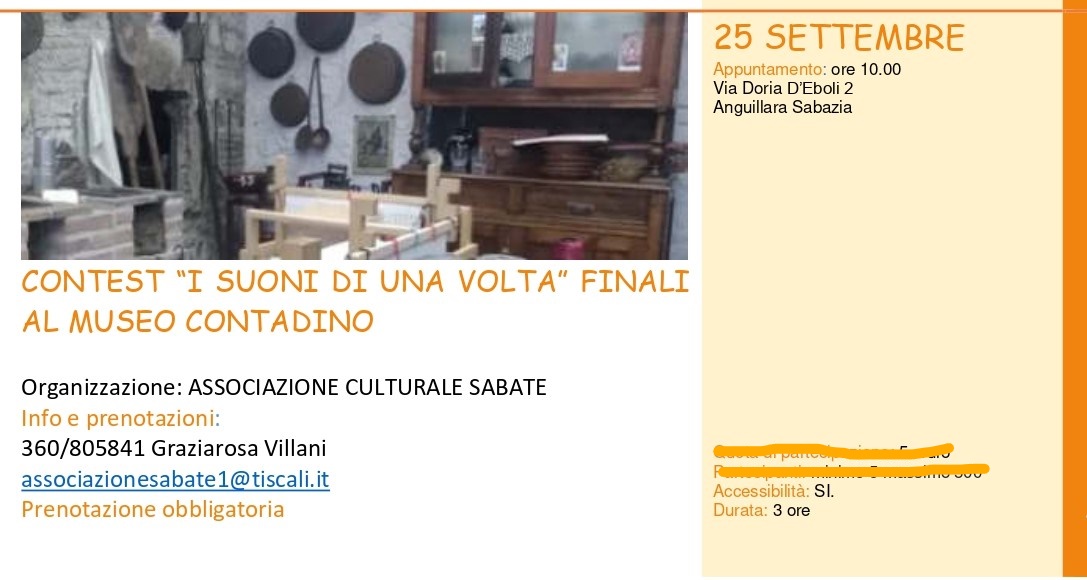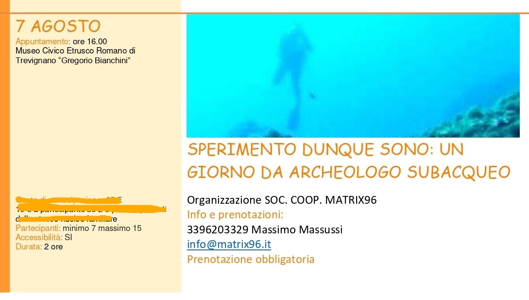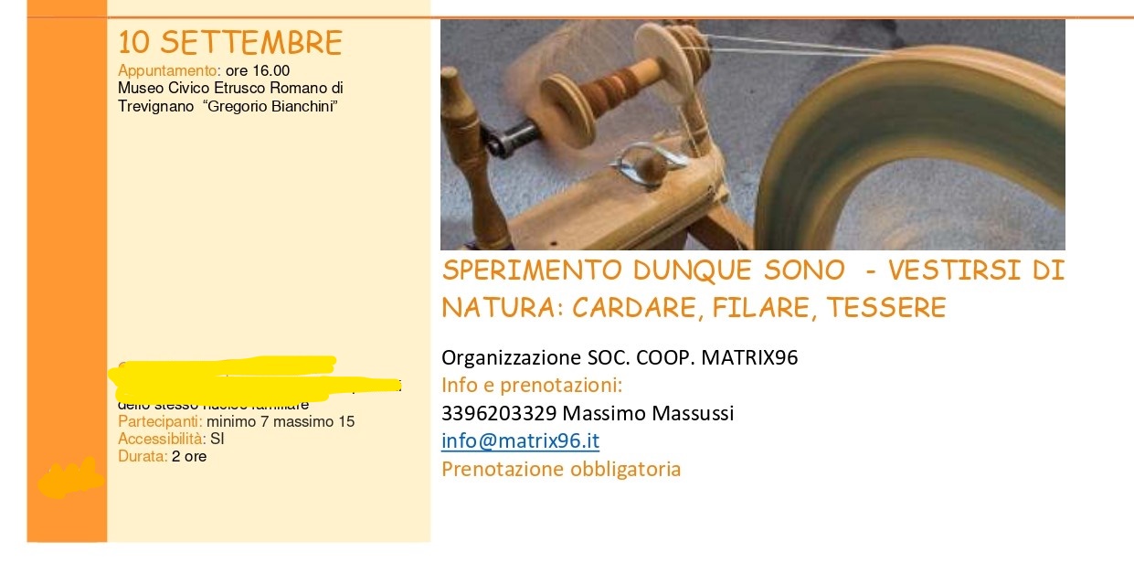 Domenica 25 Settembre 2022 Contest “I suoni di una volta”: Finali al Museo Contadino - TESORI NATURALI 2022 Il canto del gallo, un ruscello che scorre, uno sciame di vespe. Nella biodiversità del Parco a caccia di suoni da recuperare e custodire. Leggi di più Sabato 24 Settembre 2022 Magia e ragione, la natura e l’uomo - TESORI NATURALI 2022 Una passeggiata volta a chi ami stupirsi nei silenzi del bosco come davanti alla razionalità dei progetti umani. Leggi di più Domenica 18 Settembre 2022 Traversata Bassano Romano-Sutri - TESORI NATURALI 2022 Dal parcheggio di Sutri con le solo auto necessarie ci sposteremo alla faggeta di Bassano Romano da dove partiremo con L’escursione. Attraverseremo il bosco per scendere a valle attraversando la campagna che ci riporterà al parco archeologico di Sutri. Pranzo al sacco. Percorso 14km circa, facile con dislivello di 300m. Leggi di più Sabato 17 Settembre 2022 TERZA TAPPA TRAIL - ORIOLO ROMANO - TREVIGNANO ROMANO - TESORI NATURALI 2022 Ci si inerpica sui dolci rilievi dei Monti Sabatini all’interno di boschi fiabeschi in un’ atmosfera magica di serenità e dolcezza. Si cammina per diversi km lontano da centri abitati fino a raggiungere un meraviglioso affaccio panoramico sul lago. Si raggiungerà la Rocca Medievale di Trevignano Romano per godere di un incantevole spettacolo naturale tra i ruderi che evocano echi di un passato millenario in un territorio ancora in gran parte integro e naturale. Leggi di più Domenica 11 Settembre 2022 Una passeggiata tra lo spazio e il tempo, visita naturalistica guidata - TESORI NATURALI 2022 Trekking, passeggiata naturalistica Leggi di più Sabato 10 Settembre 2022 Sperimento dunque sono: vestirsi di natura, cardare, filare e tessere - TESORI NATURALI 2022 Dal vello della pecora al filo di lana. Fibre, intrecci, colori, fusi, fuseruole, aghi e telai per sperimentare la produzione dei primi tessuti, L'attività di archeologia sperimentale, indirizzata a ragazzi, adulti e famiglie. Leggi di più Sabato 3 Settembre 2022 Escursione sensoriale per famiglie - TESORI NATURALI 2022 Un’escursione naturalistica per famiglie per apprezzare e conoscere la natura da diversi punti di vista, Leggi di più Domenica 7 Agosto 2022 Sperimento dunque sono: un giorno da archeologo subacqueo- TESORI NATURALI 2022 Attività educativa-archeologica attraverso i ritrovamenti dell’archeologia subacquea. Prevista una visita introduttiva al Museo Civico Etrusco Romano 'Gregorio Bianchini' di Trevignano Romano (Roma). Leggi di più Domenica 31 Luglio 2022 Sperimento dunque sono: come si costruisce una rete da pesca? - TESORI NATURALI 2022 La rete cattura, la rete traina, la rete trascina, la rete imprigiona, la rete ingabbia. La rete cambia forma, si adatta non solo al fondale ma anche al tipo di pesca che deve svolgere. La rete è modellata e costruita dalle sapienti mani del marinaio, che maglia, ma la ripara man mano che è usurata del tempo e dalla pesca. Leggi di più Sabato 30 Luglio 2022 Geologia e archeologia del lago a bordo della motonave Sabatia II Visita guidata geologico archeologica. Viaggio a bordo della Motonave Sabatia II in compagnia di un archeologa e di una geologa per andare alla scoperta del lago visto dal lago di Bracciano. Leggi di più Domenica 24 Luglio 2022 Una passeggiata tra lo spazio e il tempo - TESORI NATURALI 2022 Visita guidata naturalistica a piedi. Il percorso parte da Cesano di Roma, in una zona di pascoli pianeggianti, e arriva fino alle sponde del lago di Martignano. Leggi di più Sabato 23 Luglio 2022 Meraviglie sutrine - TESORI NATURALI 2022 Visita storico-archeologica. Leggendariamente fondata dal dio Saturno,Sutri è sita su un promontorio a sud dei Monti Cimini, crocevia fra le terre Falische ed Etrusche, quelle dell’Etruria costiera, il Nord ed il Sud. Leggi di più