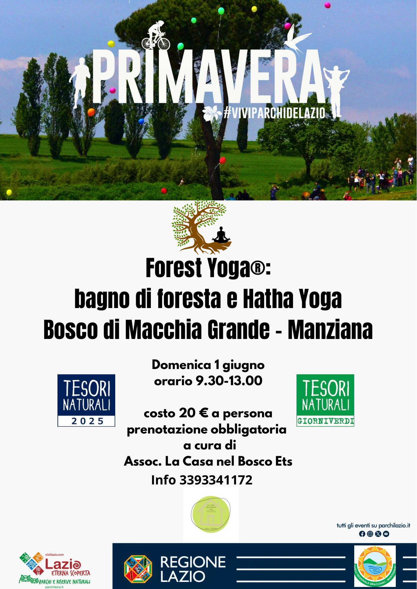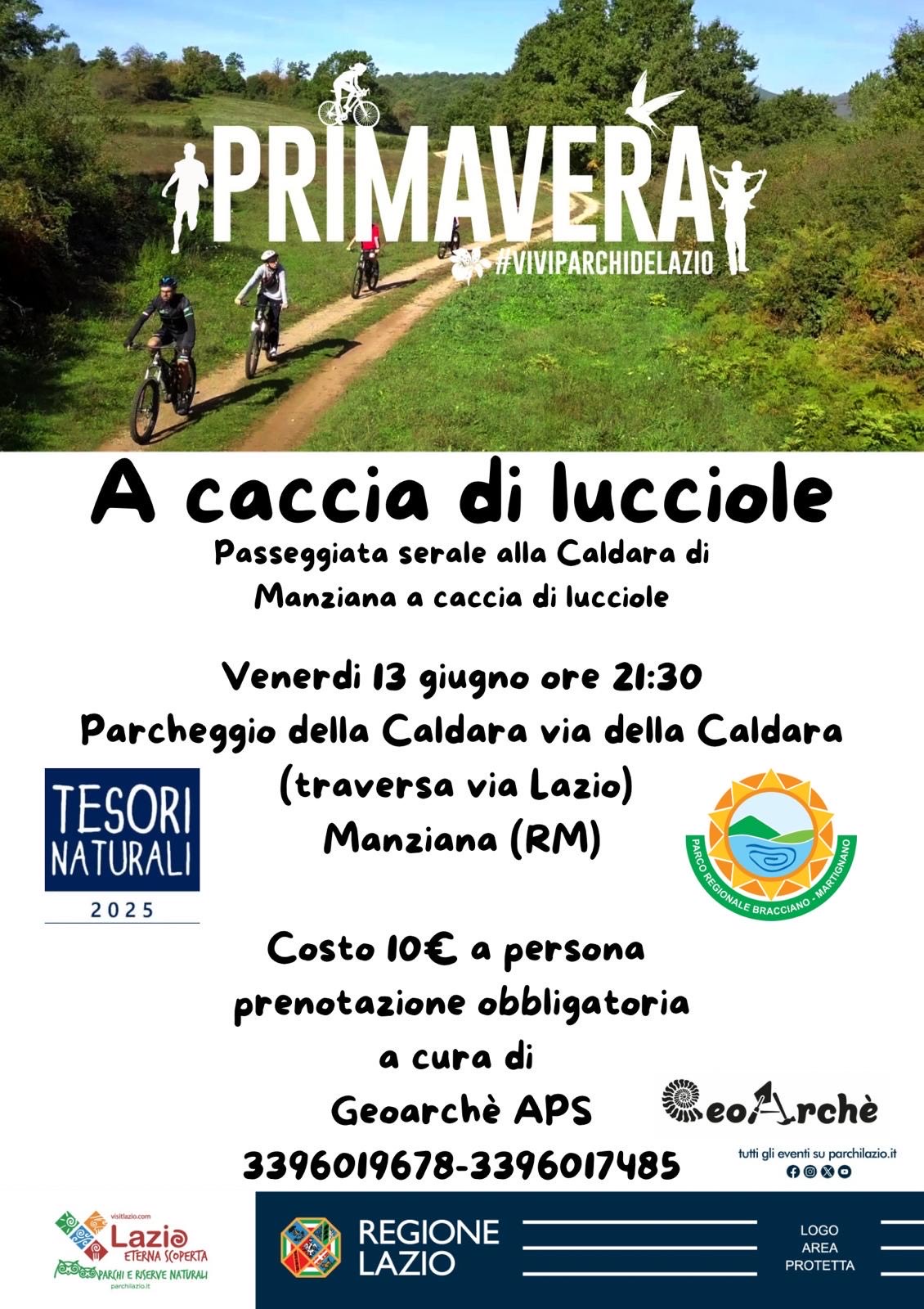 Sabato 14 Giugno 2025 LA NATURA IN UNA GIACCA - TESORI NATURALI 2025 Un modo diverso di vivere un'esperienza in mezzo alla natura accompagnati da una guida che grazie all'ausilio di una giacca misteriosa vi porterà a conoscere segreti e curiosità del bosco e dei suoi abitanti, coinvolgendo grandi e piccini in divertenti attività. Leggi di più Sabato 14 Giugno 2025 Bassano e la Madre- Itinerario tra le Madonne del Territorio- TESORI NATURALI 2025 Un cammino lento e meditativo nel cuore di Bassano Romano, alla scoperta delle raffigurazioni mariane che raccontano la devozione popolare, la storia religiosa e l’identità del territorio Leggi di più Venerd' 13 Giugno 2025 A caccia di lucciole - TESORI NATURALI 2025 Passeggiata all’interno del sito Monumento Naturale Regionale La Caldara di Manziana, con iniziale spiegazione geologica dell’area , arricchito da leggende del posto, infine ci si sposterà verso il boschetto di betulle alla ricerca delle lucciole (si consiglia di portare torcia o frontalino, antizanzare INDISPENSABILE e un giacchetto per l’umidità) Leggi di più 8 Giugno 2025 Il mondo delle api - TESORI NATURALI 2025 Unisciti a noi in un’attività didattica dove scopriremo da vicino la vita delle api, piccoli insetti straordinari e indispensabili per la natura! Leggi di più 8 Giugno 2025 DA TREVIGNANO ALLA ROCCA - TESORI NATURALI 2025 L’escursione partirà dal Pontile sul lago a Trevignano Romano e si concluderà presso la Rocca degli Orsini Leggi di più Sabato 7 Giugno 2025 UNA PASSEGGIATA TRA LO SPAZIO E IL TEMPO - TESORI NATURALI 2025 Il percorso parte da Cesano di Roma, in una zona di pascoli pianeggianti e arriva fino alle sponde del lago di Martignano. Leggi di più 7 Giugno 2025 SABATINO HIKING TRAIL – III TAPPA: ORIOLO R. – TREVIGNANO R.- TESORI NATURALI 2025 Ci si inerpicheremo sui dolci rilievi dei Monti Sabatini all’interno di boschi fiabeschi in un’atmosfera magica di serenità e dolcezza. Leggi di più 7 Giugno 2025 MINFULLNESS NEL BOSCO - TESORI NATURALI 2025 A CURA DI GIORGIO OLIVETTI (CENNI STORICI E ARCHEOLOGICI SUL TERRITORIO) E TIZIANA FRANCESCHINI, PSICOTERAPEUTA, INSEGNANTE DI YOGA E MINDFFULNESS Leggi di più Domenica 1 Giugno 2025 Forest Yoga® nel bosco: bagno di foresta e Hatha Yoga nel Bosco di Manziana - TESORI NATURALI 2025 Lo Yoga è una disciplina molto antica in grado di generare armonia, equilibrare corpo, mente ed emozioni, apportare un benessere psico-fisico. La Natura ci invita a riscoprire la connessione mente-corpo-spirito, movimento e respiro, pause e azione. In natura ci sentiamo più liberi, meno condizionati da schemi e pregiudizi, e possiamo entrare in contatto più facilmente con la parte più intima di noi, per raggiungere consapevolezza. Leggi di più Domenica 1 Giugno 2025 SABATINO HIKING TRAIL – II TAPPA: BRACCIANO – ORIOLO ROMANO - TESORI NATURALI 2025 2^ Tappa: Bracciano – Manziana – Oriolo Romano Leggi di più Dabato 24 Maggio 2025 SABATINO HIKING TRAIL – I TAPPA: ANGUILLARA S. - BRACCIANO Partendo dalla Porta del Parco di Bracciano-Martignano, ci dirigeremo verso il borgo di Anguillara Sabazia dove ci si districherà all’interno del centro storico godendo del magnifico affaccio sulle acque del lago. Leggi di più Sabato 24 Maggio 2025 Introduzione al riconoscimento e uso delle erbe officinali Raccolta e preparazione di derivati per uso fitoterapico e fitocosmetico Leggi di più